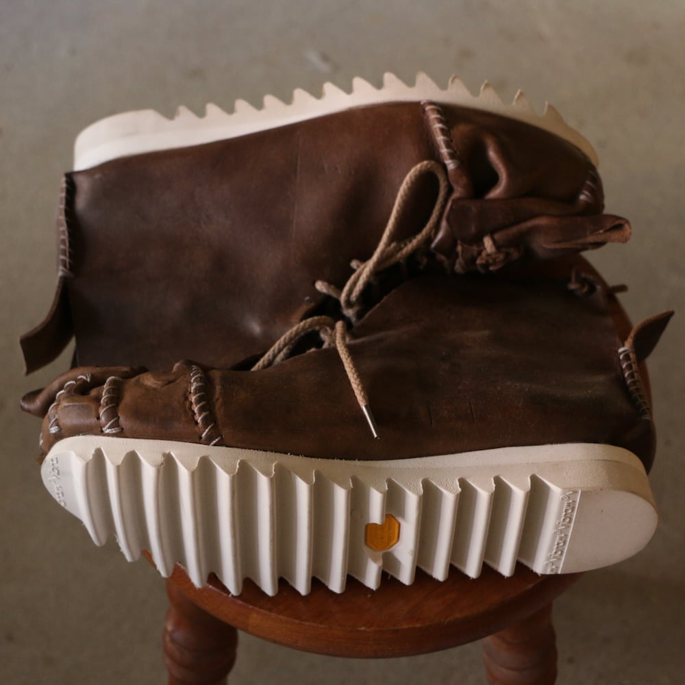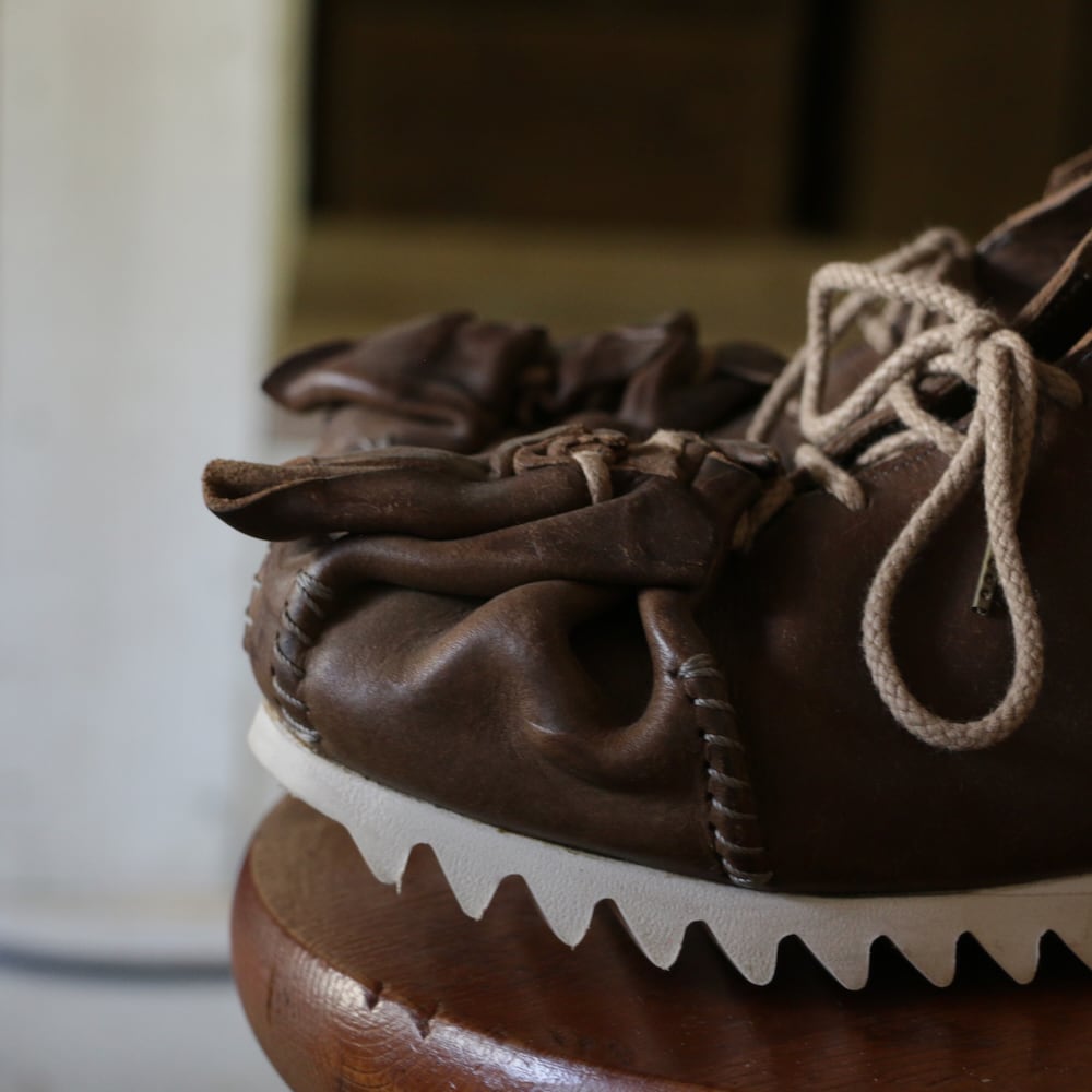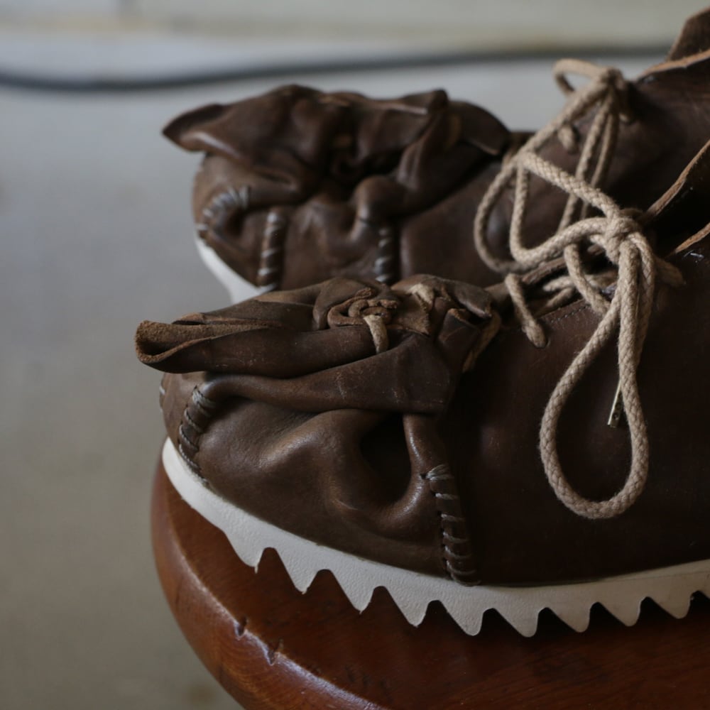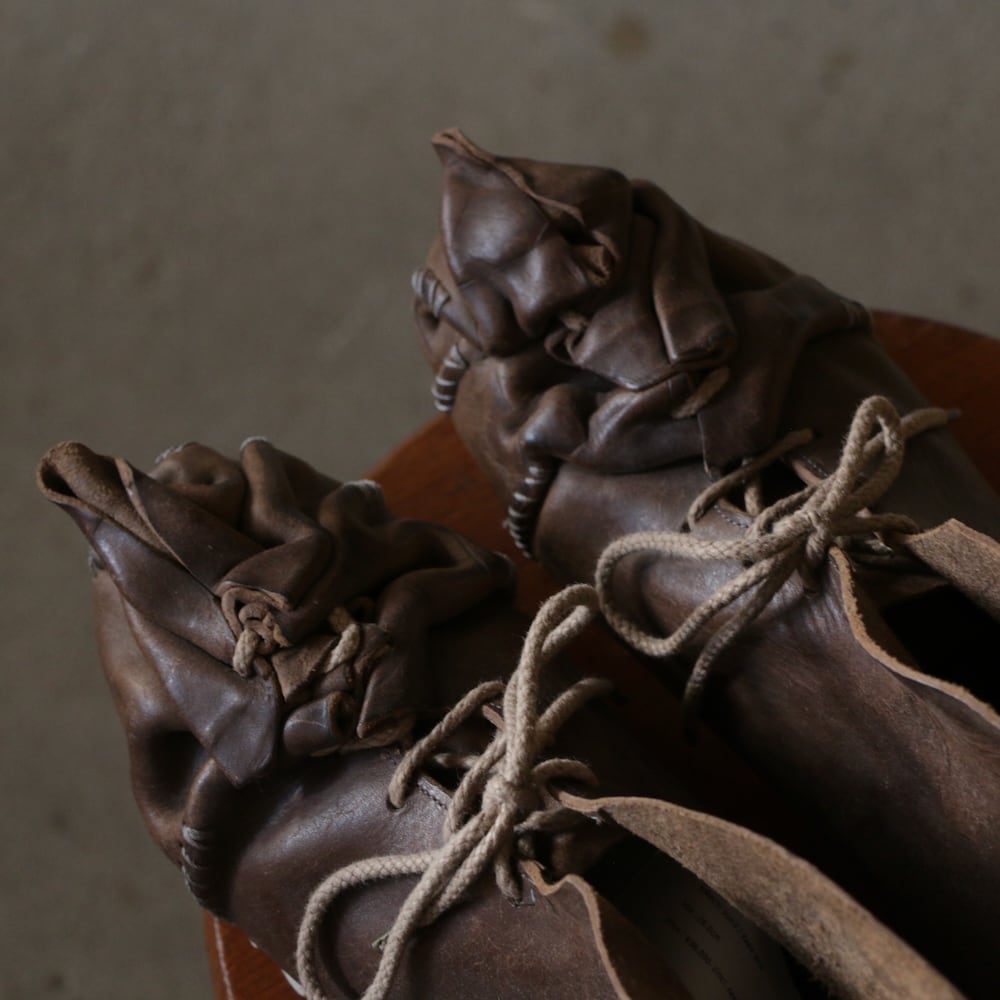 木型を一枚の革で包み込み、靴紐を巾着袋の口のように、ぎゅっと結んでできた靴。