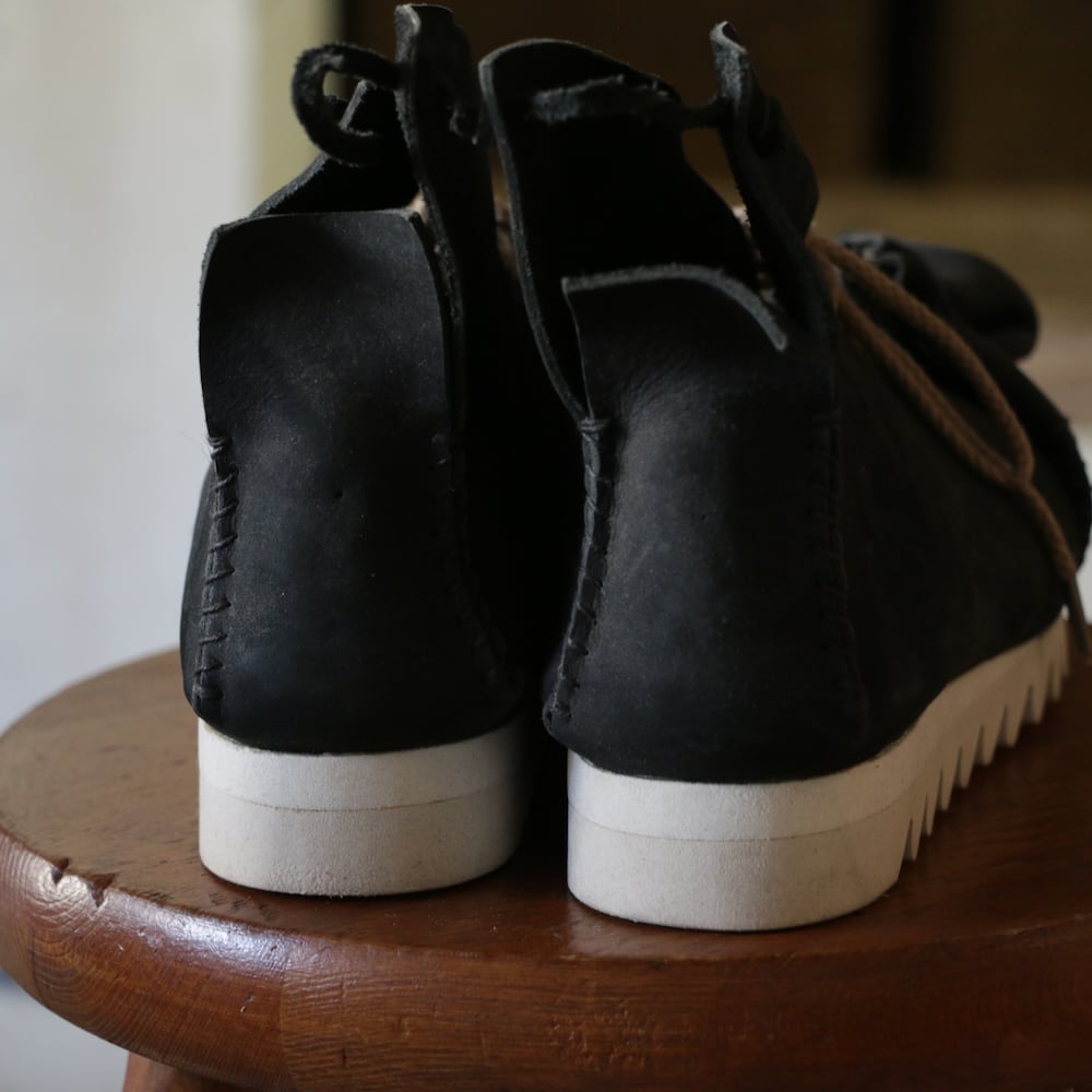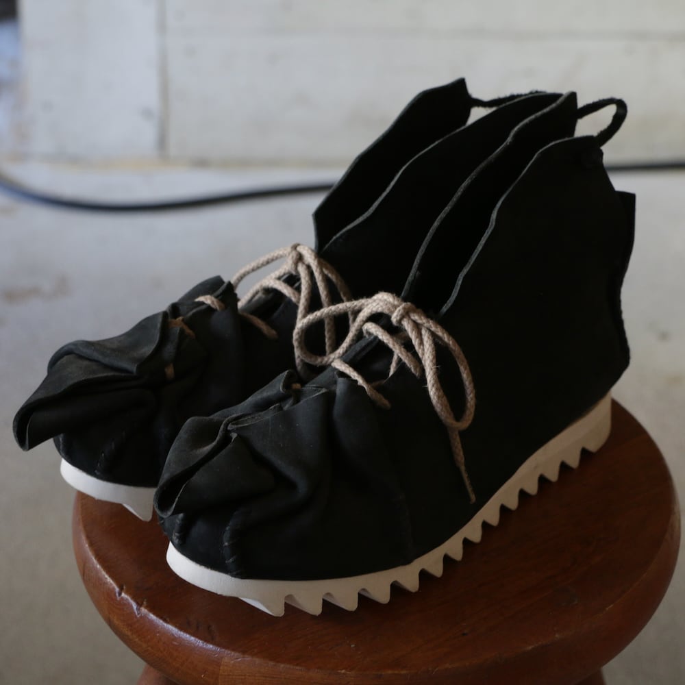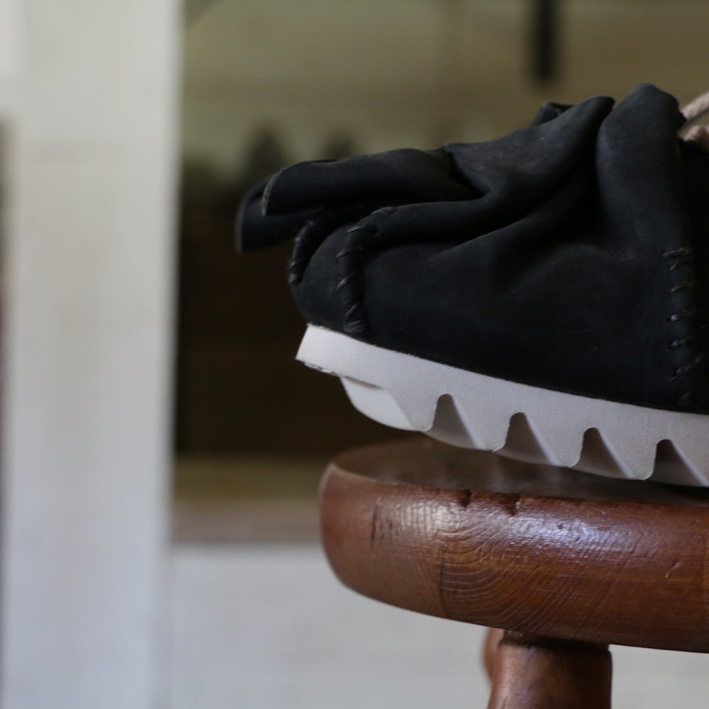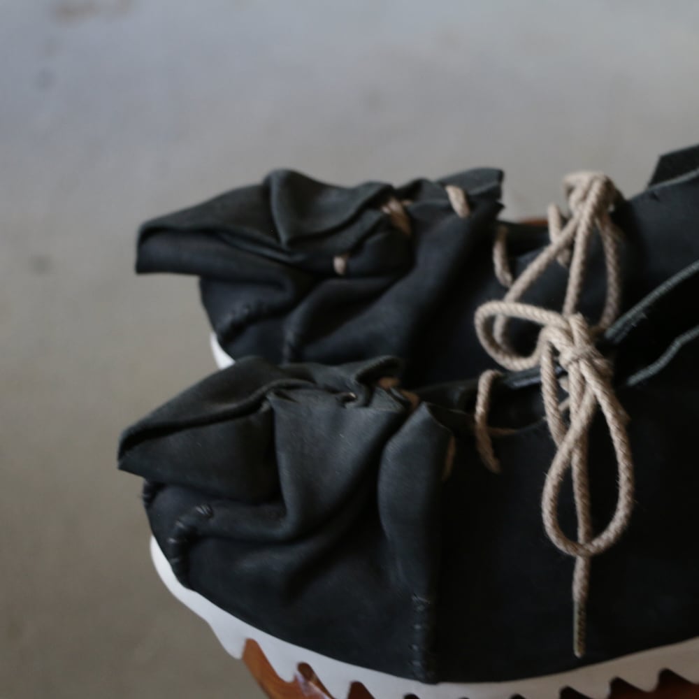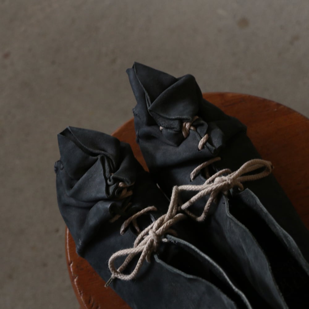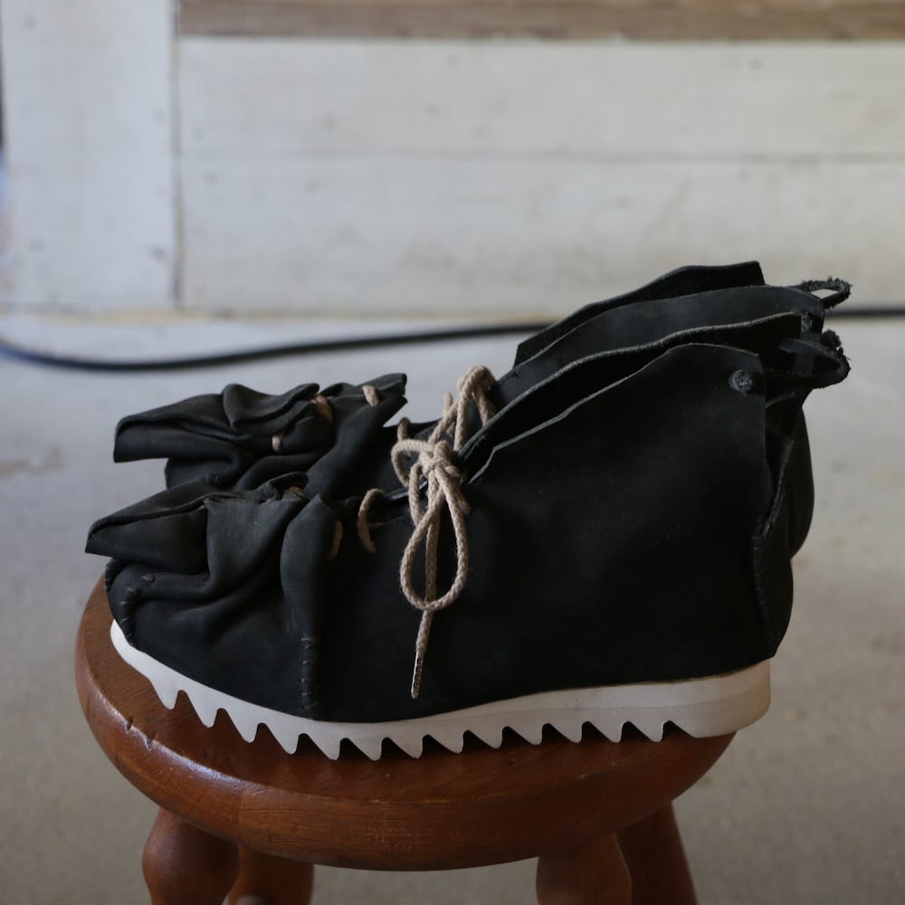 木型を一枚の革で包み込み、靴紐を巾着袋の口のように、ぎゅっと結んでできた靴。