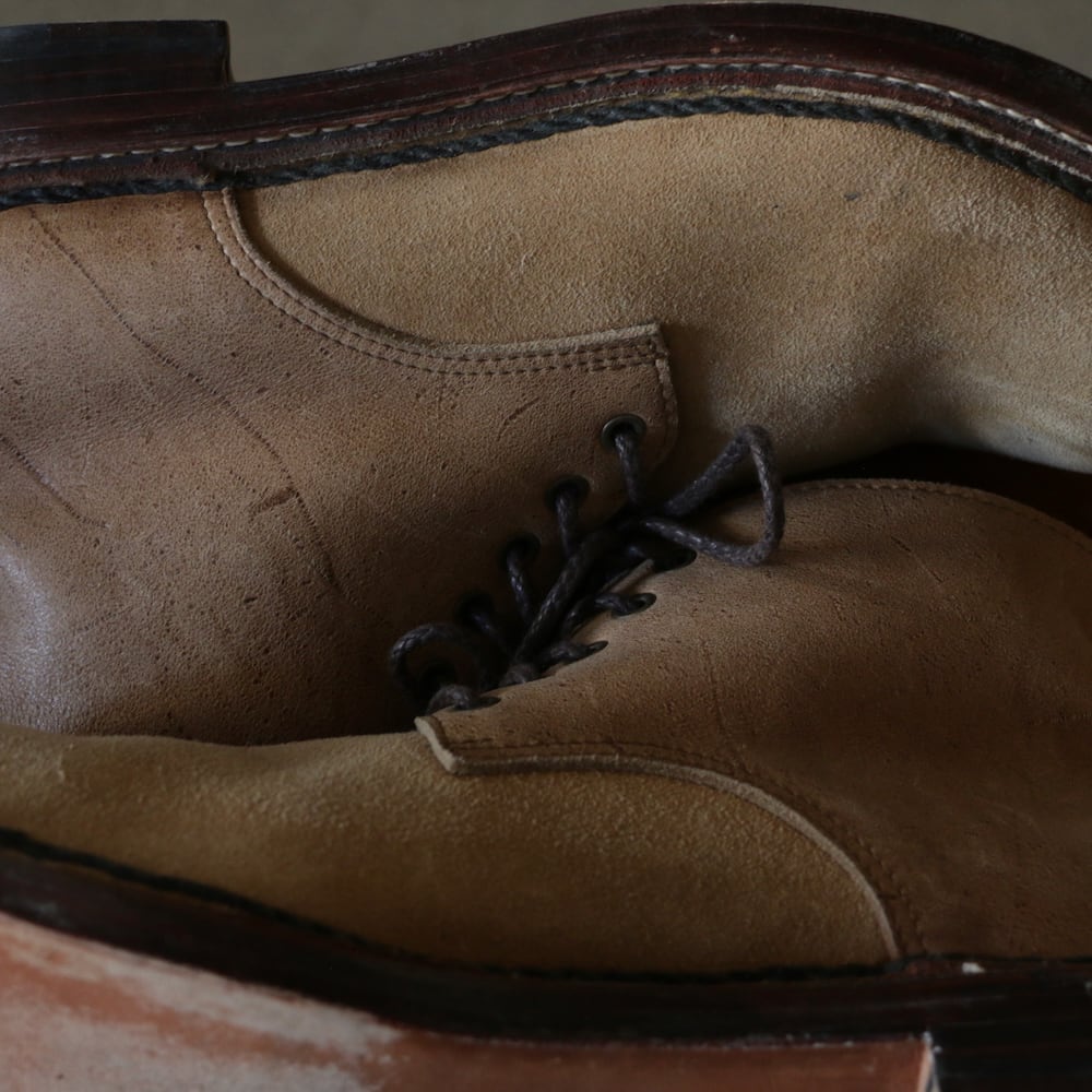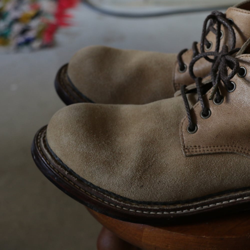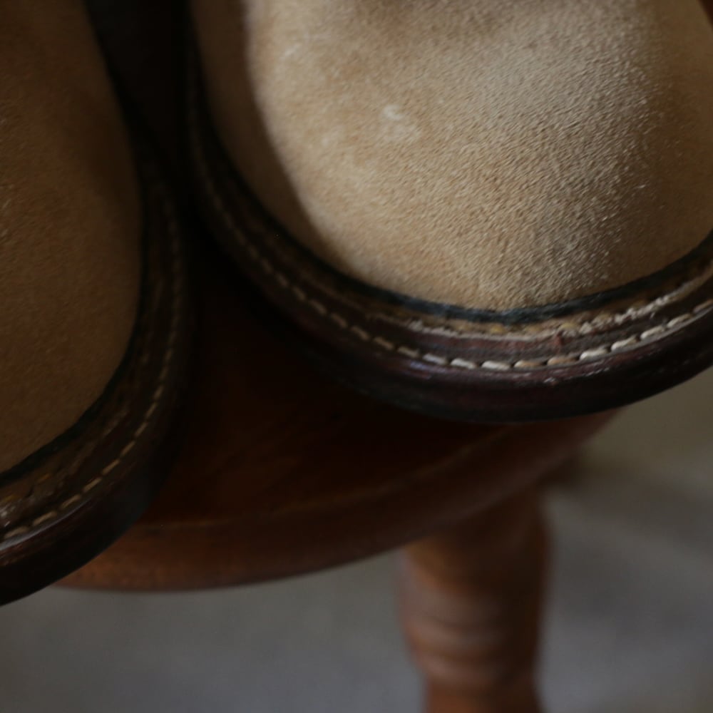 【 素材 】アッパーに使用されているのはKUDU(クードゥー)レザー。南アフリカに生息する、鹿のようのなツノを持つウシ科の動物で、野生で野山を駆け回ったり、喧嘩をしてできた表皮の傷が特徴的な革となっています。革のなめしを行うのはイギリスの老舗タンナー、チャールズ・F・ステッド社だけに、スエード面の美しさも絶品。肉厚でありながら、粘り強く柔らか。非常に足馴染みのよい素材です。