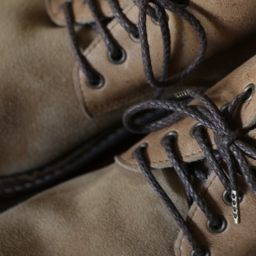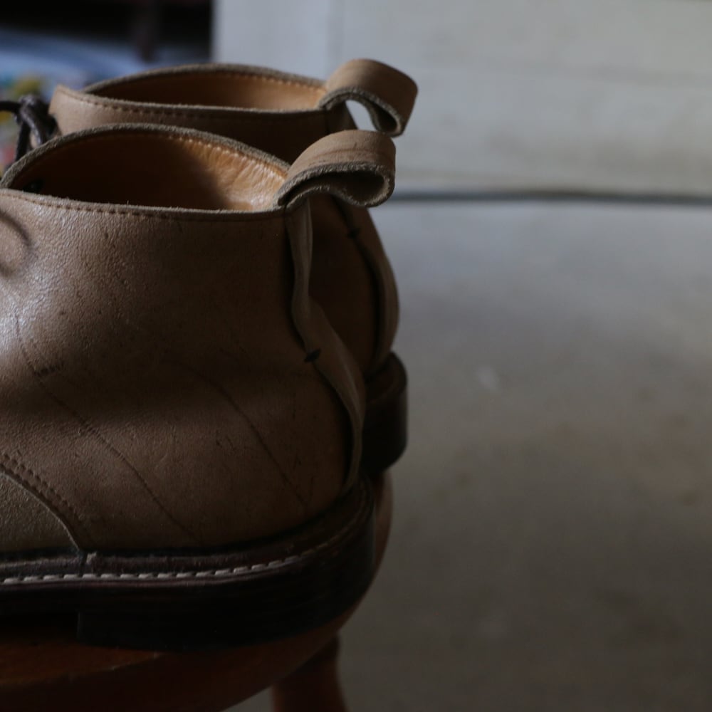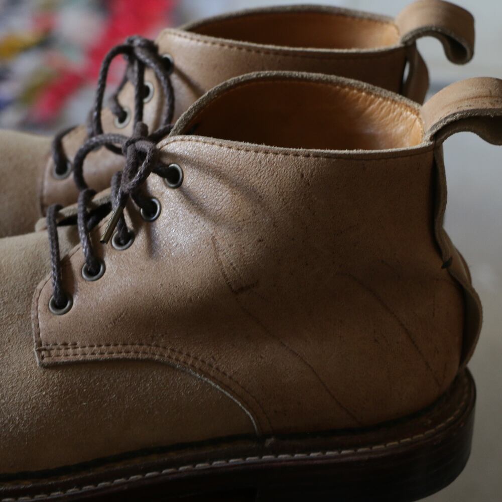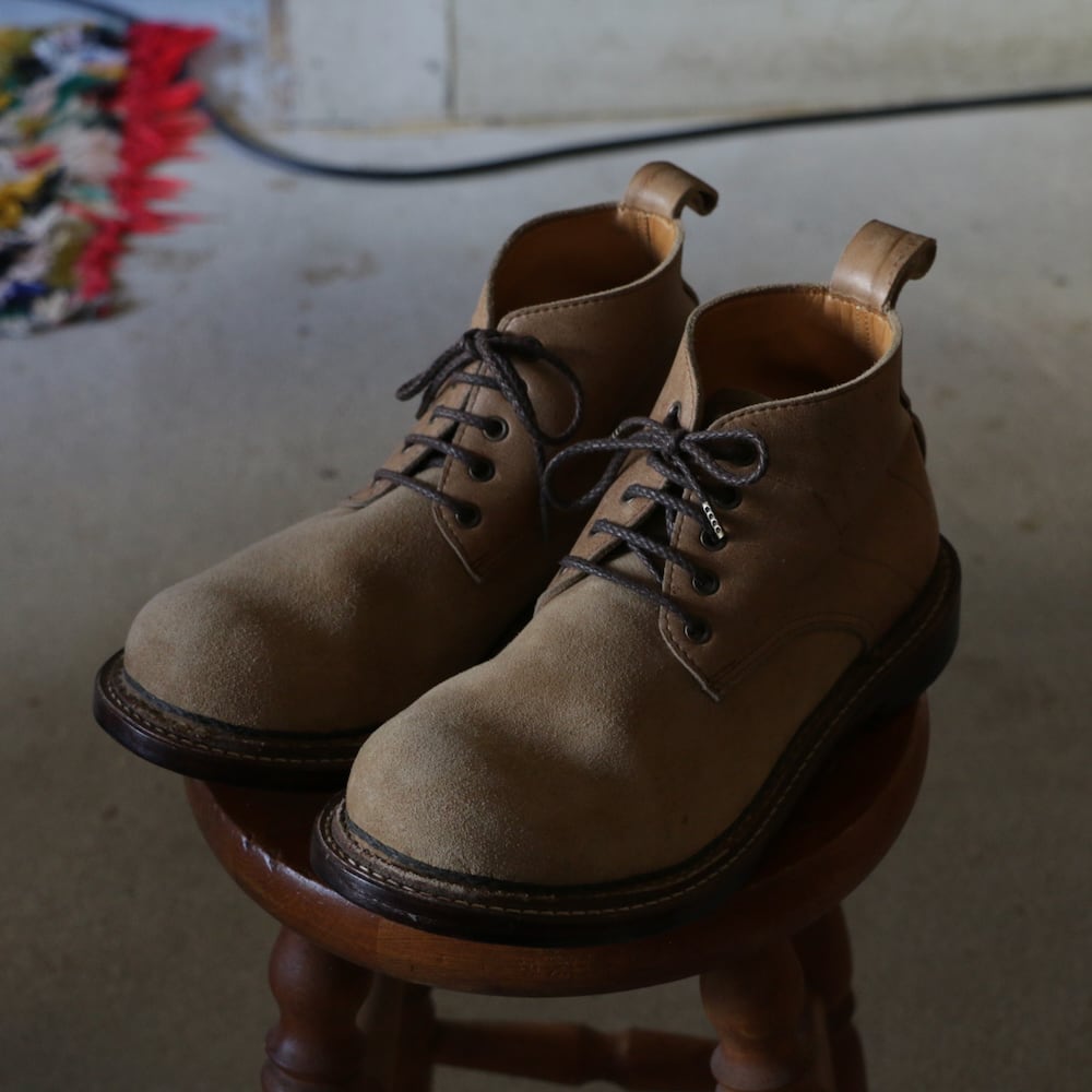 【 素材 】アッパーに使用されているのはKUDU(クードゥー)レザー。南アフリカに生息する、鹿のようのなツノを持つウシ科の動物で、野生で野山を駆け回ったり、喧嘩をしてできた表皮の傷が特徴的な革となっています。革のなめしを行うのはイギリスの老舗タンナー、チャールズ・F・ステッド社だけに、スエード面の美しさも絶品。肉厚でありながら、粘り強く柔らか。非常に足馴染みのよい素材です。