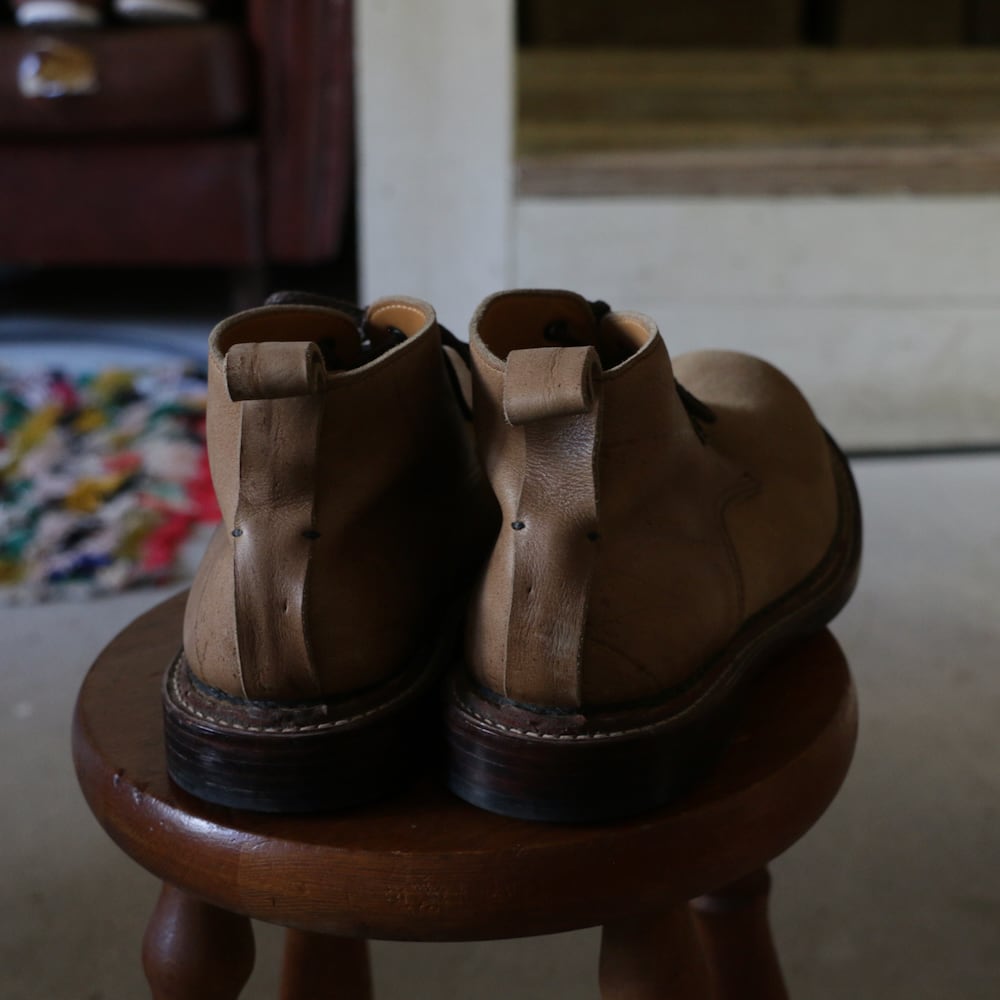 【 製法・ソール 】製法はノルベジェーゼ。ソールの側面の装飾的なステッチワークが特徴的です。ソールに見えるのは3本の太いステッチ。アッパーとミッドソールにチェーンステッチをかけ、その後アウトソール上段とアッパーを縫い付けます(ミッドステッチ)。最後にアウトソール全体を縫い付ければ完成。同ブランドの中では、最も装飾的であり、堅牢な佇まいとなるソール形状を生み出す製法となり、またチェーンステッチ、ミッドステッチはすべて手作業で、手間と技術が必要です。ソールはダブルソールで、よりボリュームを。その分、はじめの馴染みにくさは否めませんが、履き込むにつれ、屈曲部分が柔らかくなり、まるで自身の足のように機能してくれるでしょう。