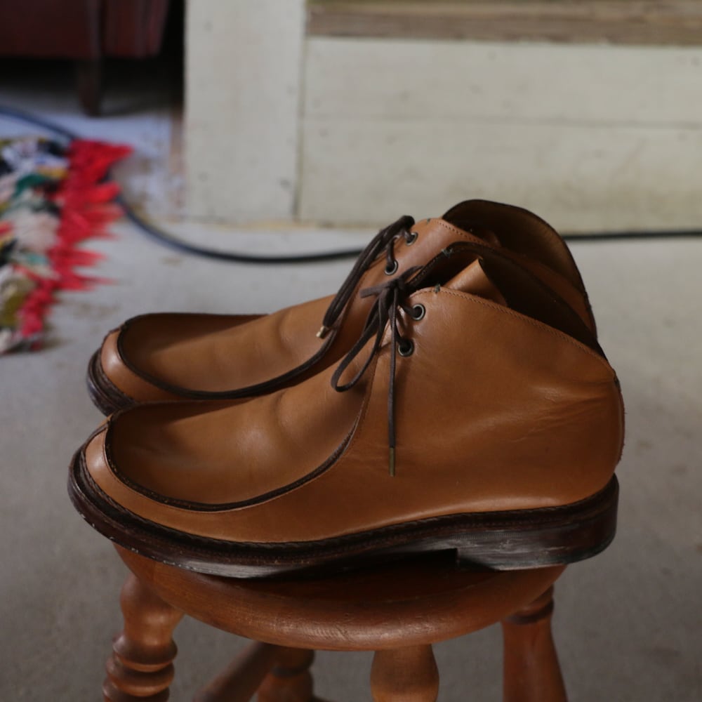 つま先の形状がアヒルのくちばしのようなことから「クレイジーダック」と名付けられた本品のデザイン・ソースはチロリアンシューズ。モカシンのように袋状にあしらわれたアッパーの履き口部分をふたつのシューホールでホールド。ぽってりとした木型の形も手伝って、愛らしい表情となっています。