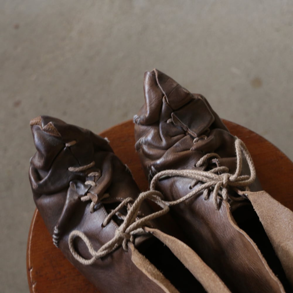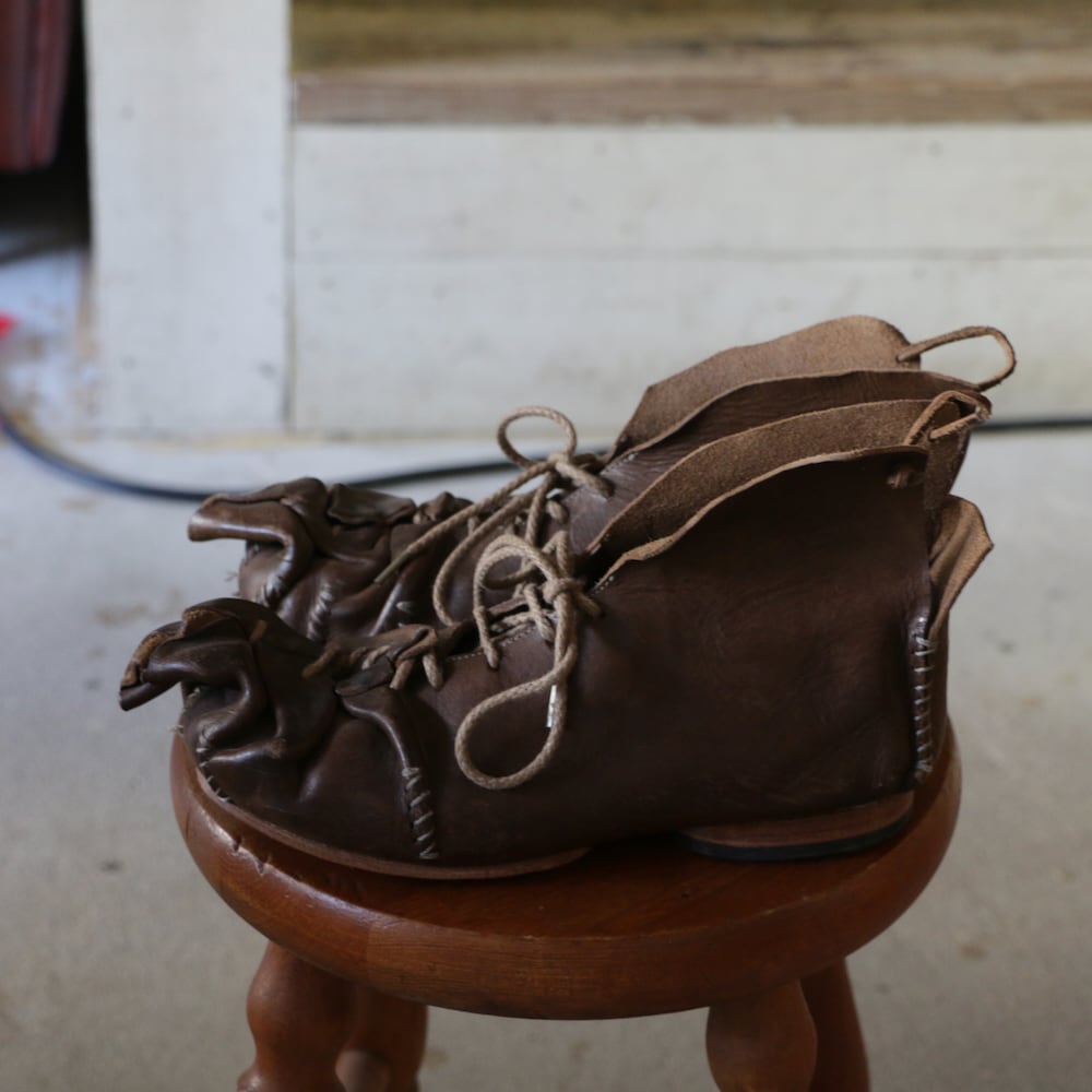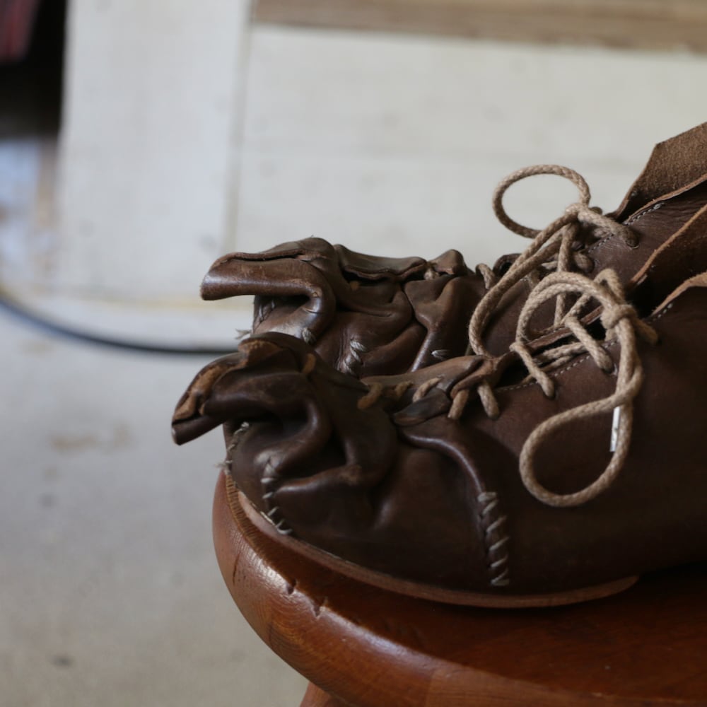 木型を一枚の革で包み込み、靴紐を巾着袋の口のように、ぎゅっと結んでできた靴。
