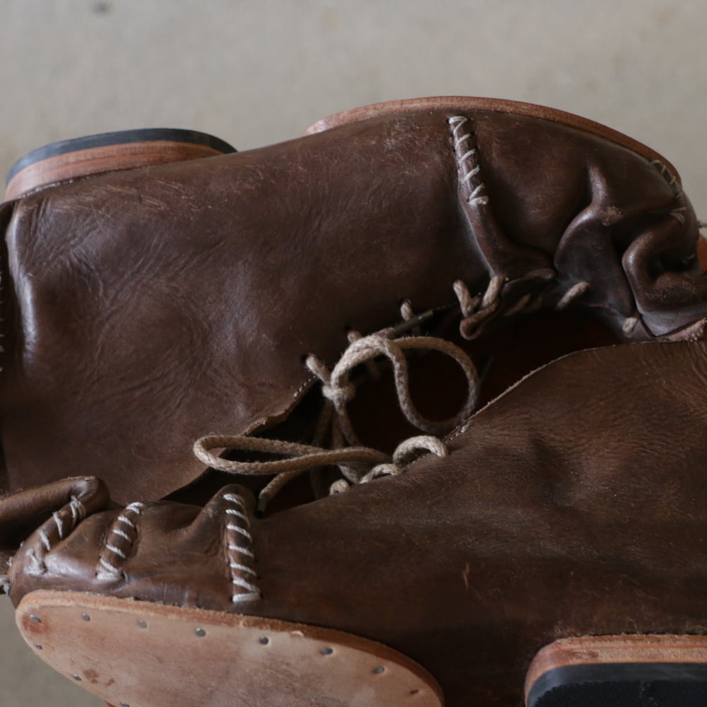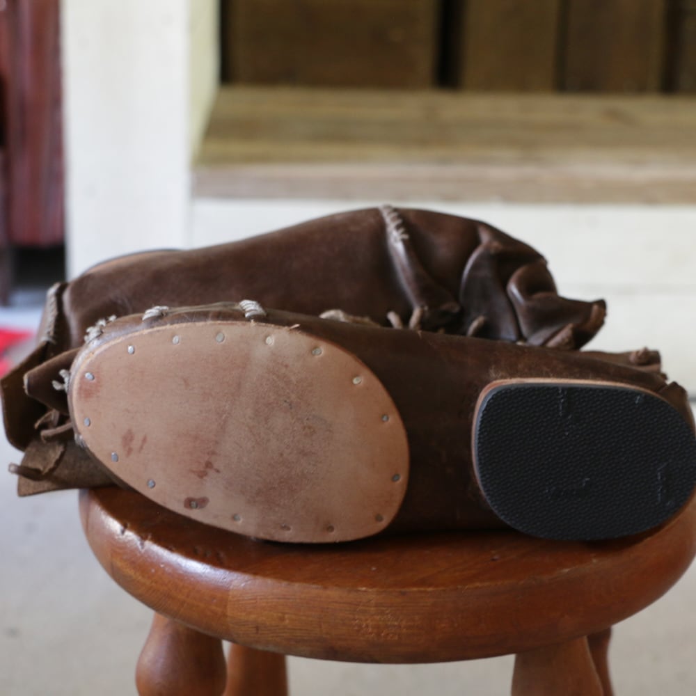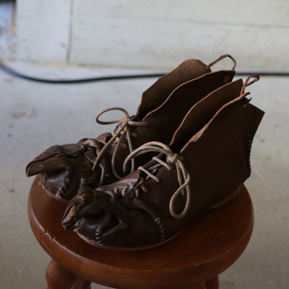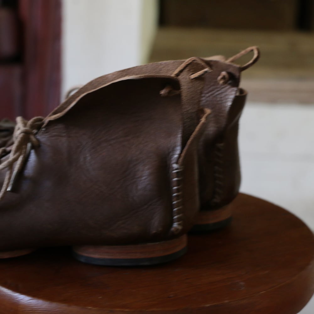 木型を一枚の革で包み込み、靴紐を巾着袋の口のように、ぎゅっと結んでできた靴。