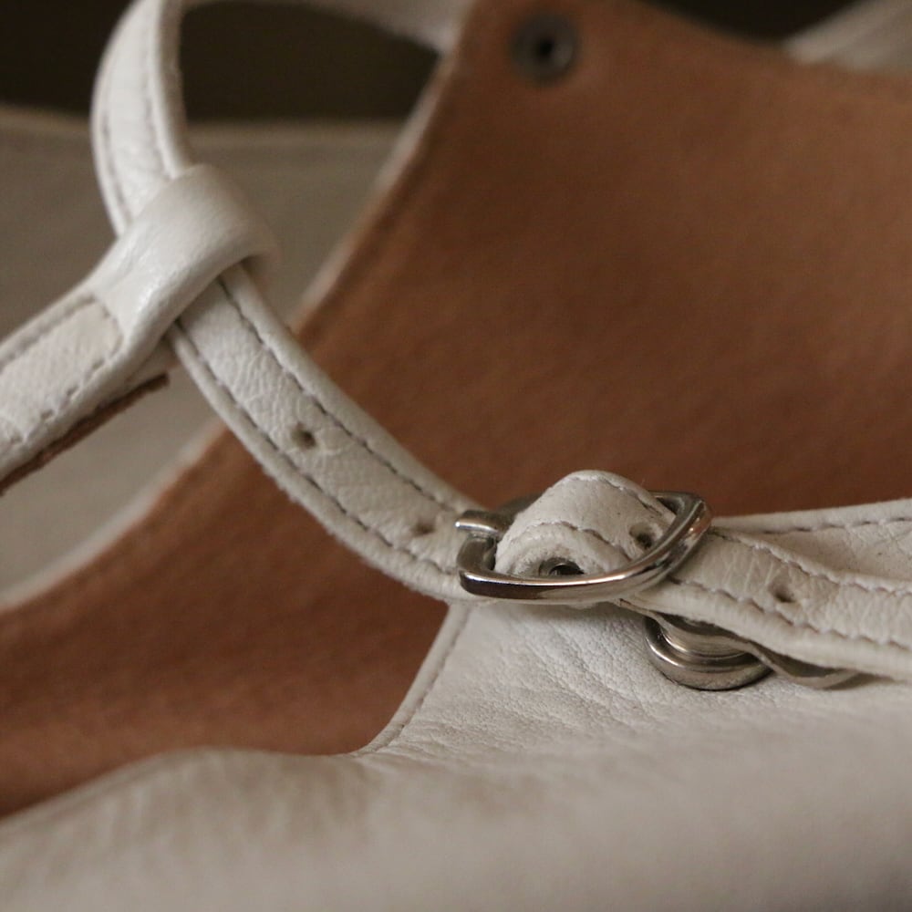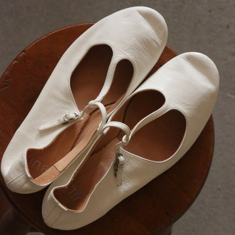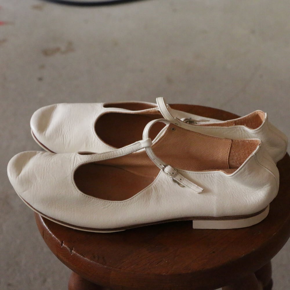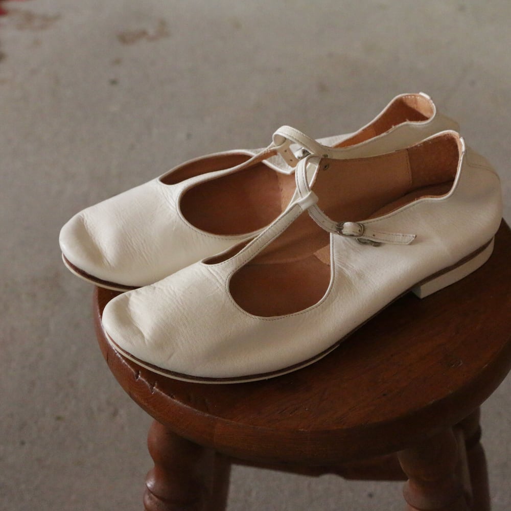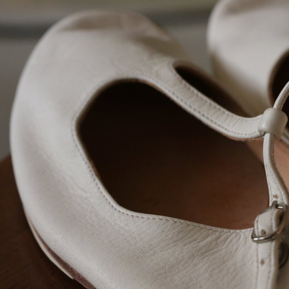 ヌーディーで、繊細で、それでいて快適な履き心地の靴をと、Tストラップシューズに至りました。